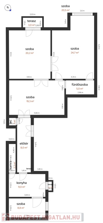 A két nagy szoba a Vérmzőre néz. Egy hall-ból nyílik, ami rugalmasan berendezhető, akár étkezőnek is.