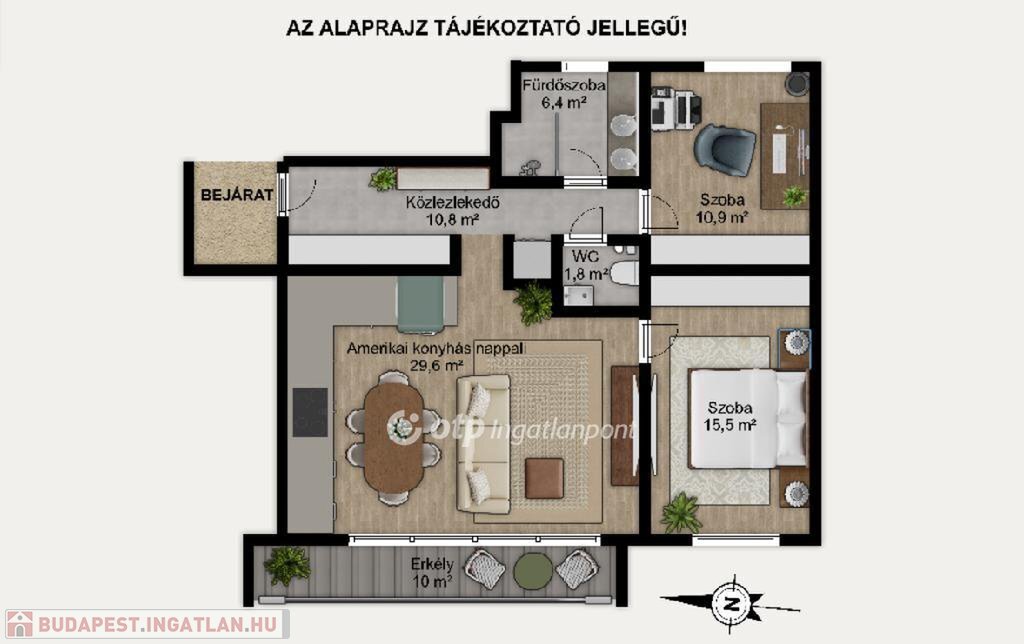 Az amerikai konyhás nappali és a két különálló szoba harmonikus elrendezést kínál.