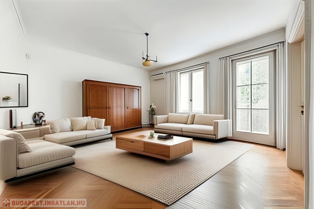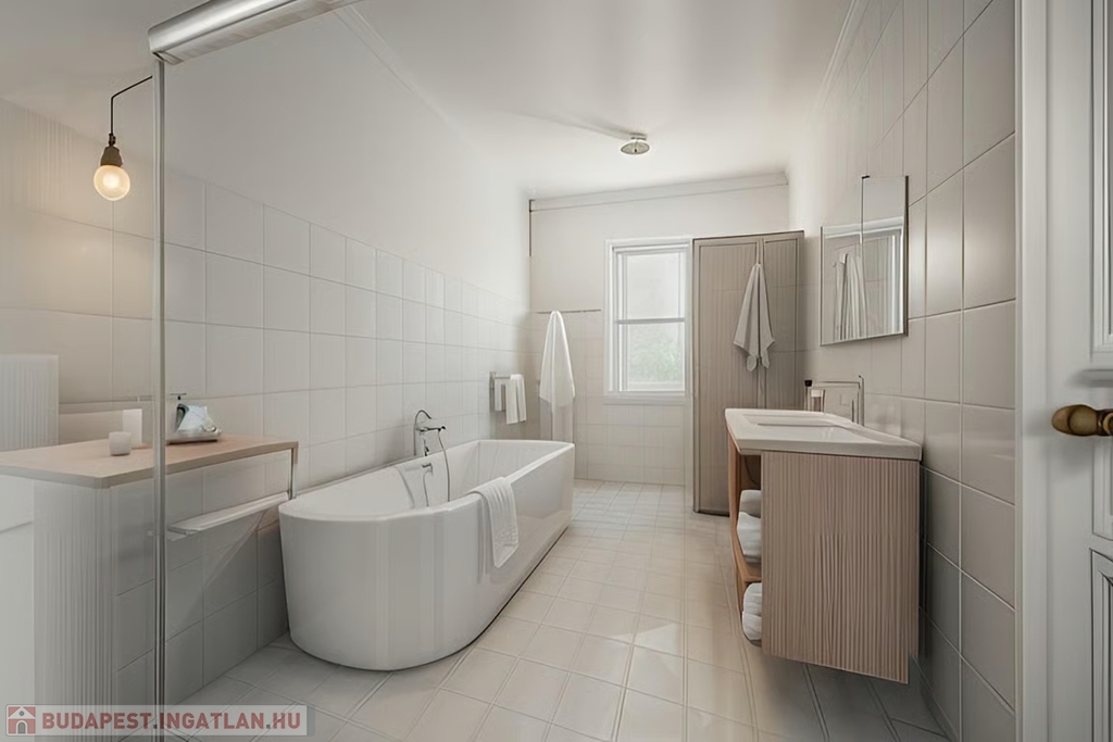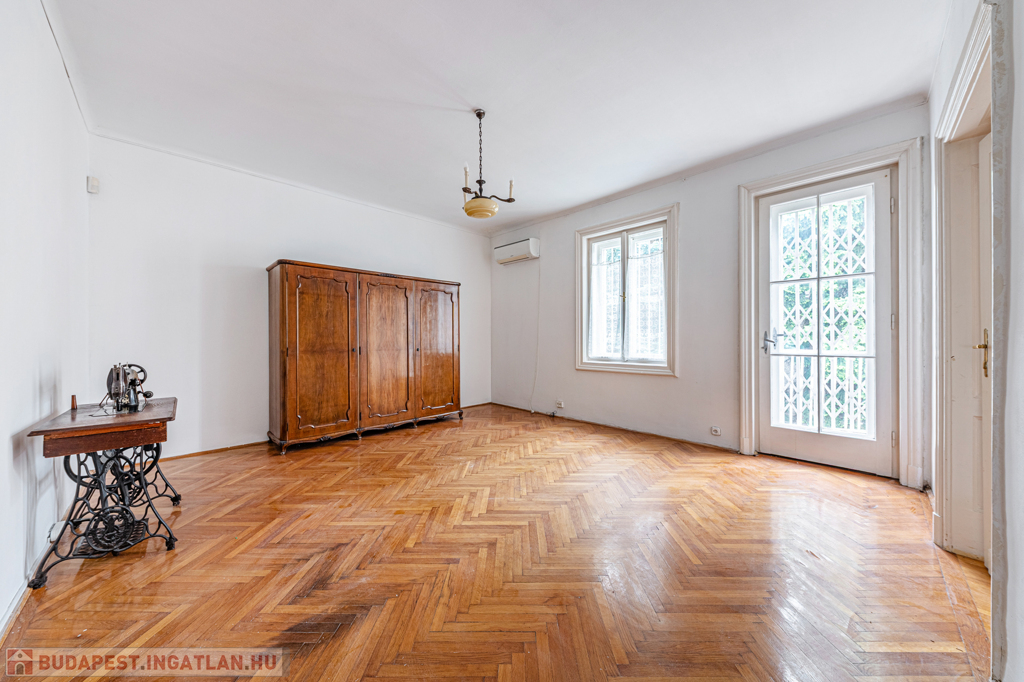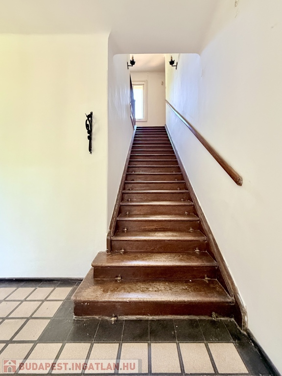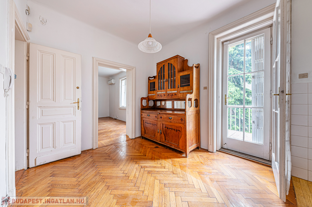 Az emeleten elhelyezkedő lakásba - egy kényelmes méretű fogadótérből induló - impozáns tömörfa lépcső vezet, helyiségeire jellemző a tágasság, a benapozottság, mindhárom jól bútorozható, tömörfa parkettás, klimatizált szobájából közvetlen kapcsolat nyílik a kellemes, délnyugati tájolású, 40 nm-es teraszra. Az eredeti külső- és beltéri tömörfa nyílászárókat megőrizték jó állapotukban, az ablakok, erkélyajtók zsalugáteres árnyékolása is gondoskodik a korabeli hangulatról. A lakás radiátoros fűtését gázkazán biztosítja. A 116 nm-es, nagyvonalú térelosztású lakáshoz tartozik a teljes lakóterülete feletti, ~100-nm-es, beépíthető tetőtér, lehetőséget nyújtva az élettér megnövelésére.