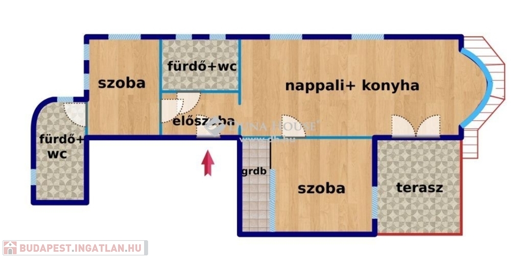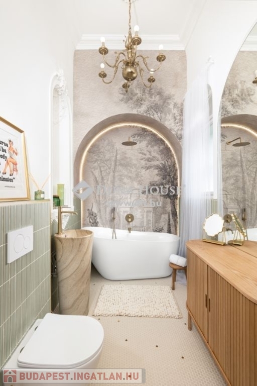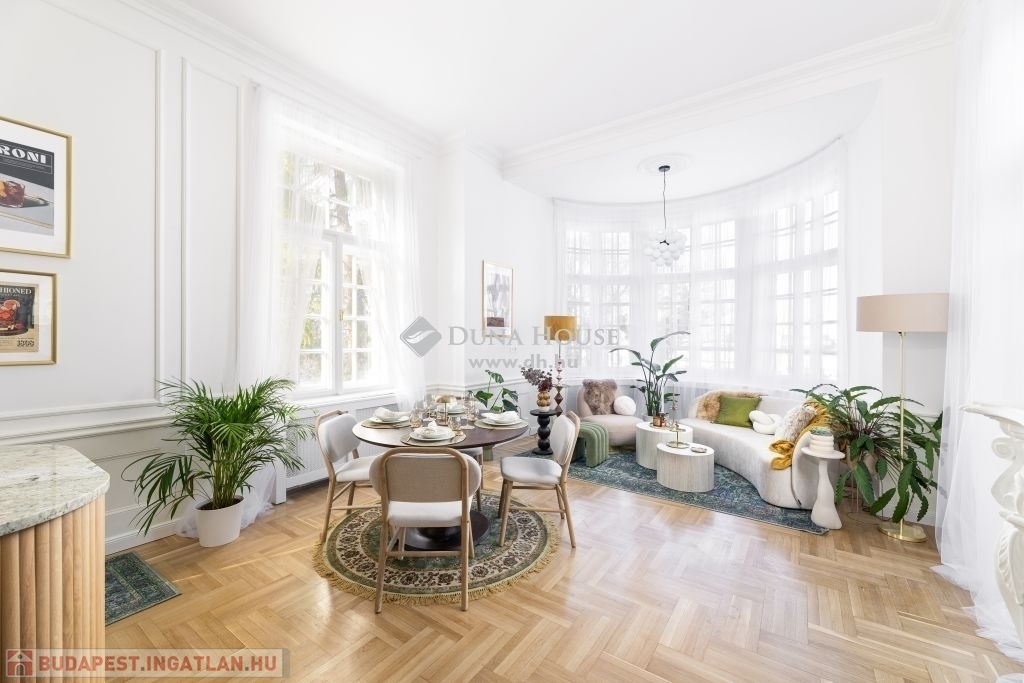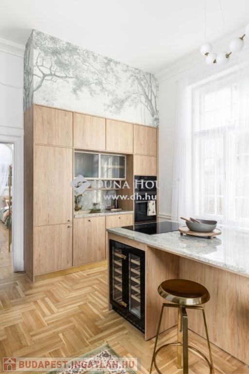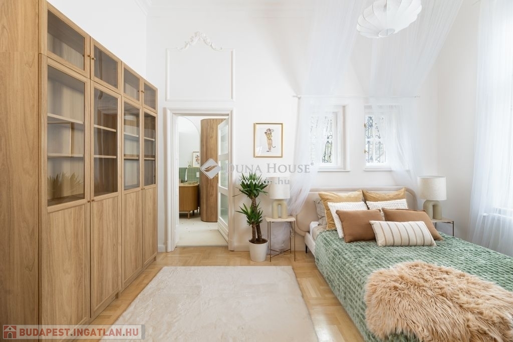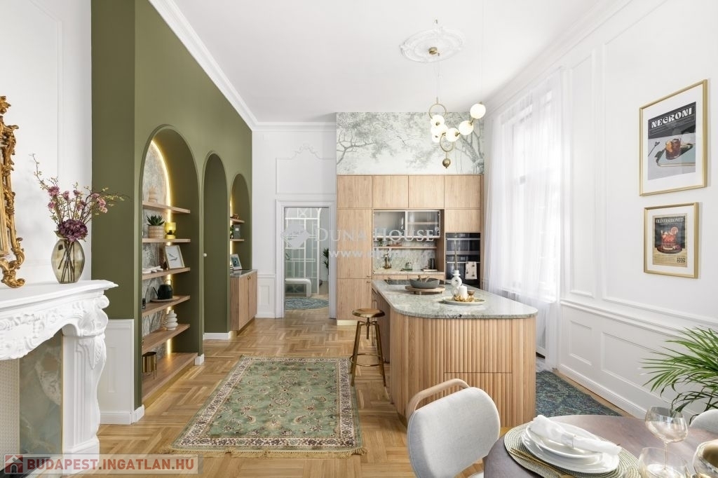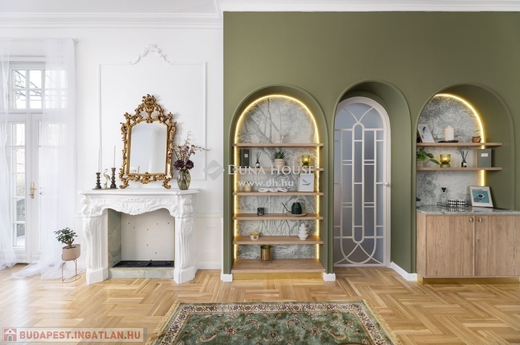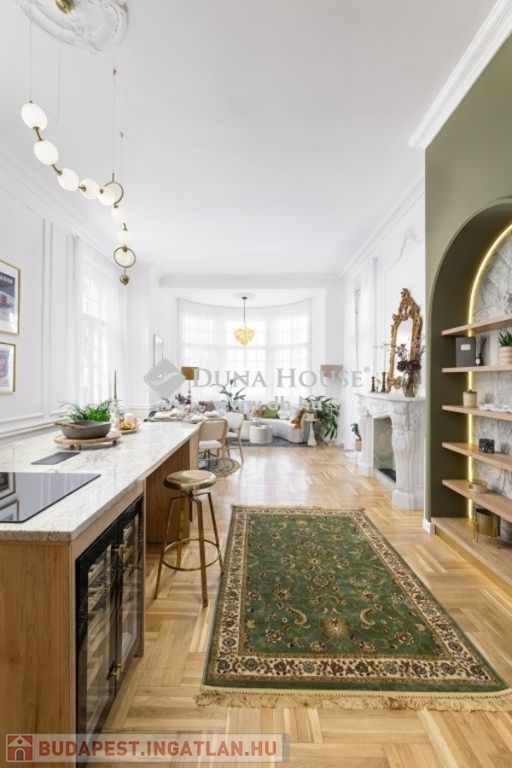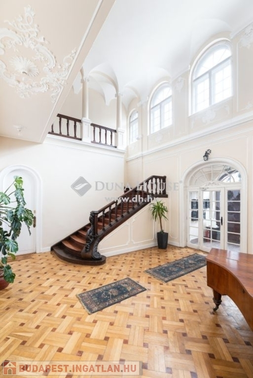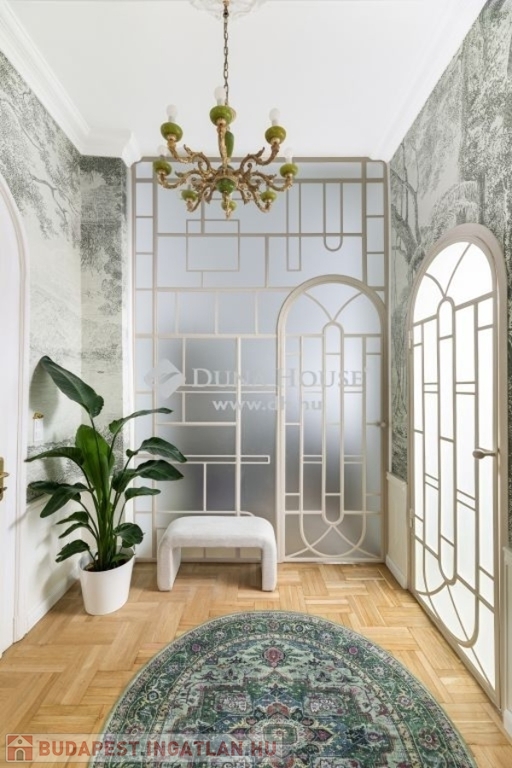 A dupla komfortos lakás az impozáns közös előtérből – a hajdani bálteremből – közelíthető meg.Az épület korszerűsítése évek óta folyik. A közös előtér, a házközponti fűtési rendszer (kondenzációs kazán, egyéni költségmegosztók), a közös villanyhálózat, a kaputelefon a főhomlokzat és a bejárat felújítása már megtörtént.A lakáshoz tartozik pincerész, valamint szokásjog alapján használható 300nm-es kertrész is, amit a teraszról levezető lépcsőn közelíthetünk meg.