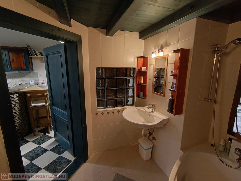 A fürdőszobában tágas sarokkádban fürödhetünk,a wc külön helyiségben kézmosóval is fel van