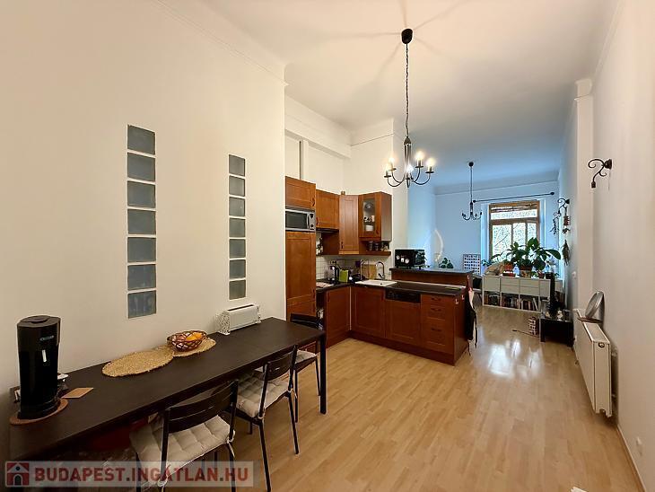 A lakás központi része a 32 m²-es amerikai konyhás nappali, amely tágas, napfényes és otthonos hangulatú. Az ablakok a zöldövezetre és a Vár aljára néznek, így a lakás különösen nyugodt környezetet biztosít.