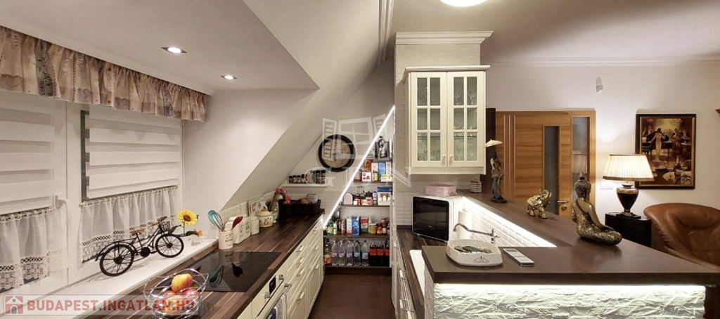 Az 5 lakásos, liftes társasházban található ingatlan világos, jól elosztott, magas minőségben kialakított. A konyha gépesített, a fürdőszobában Grohe és Duravit szaniterek, a nappaliból és hálóból hegyekre néző panoráma.