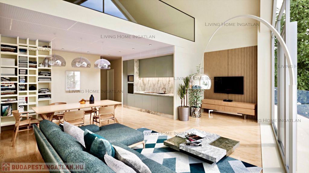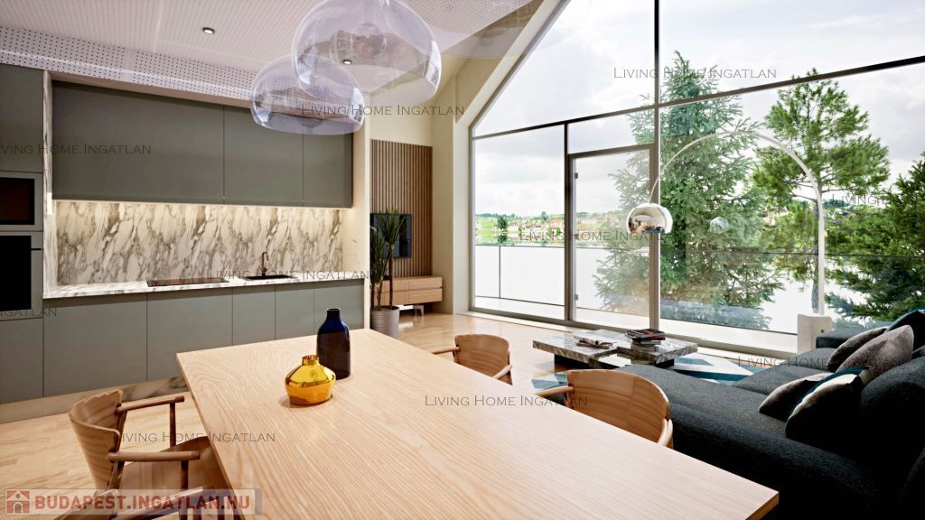 A déli tájolású nappali és a nagyméretű üvegfelületek páratlan fényviszonyokat és örökpanorámát biztosítanak, amely a nap minden szakában különleges atmoszférát teremt.