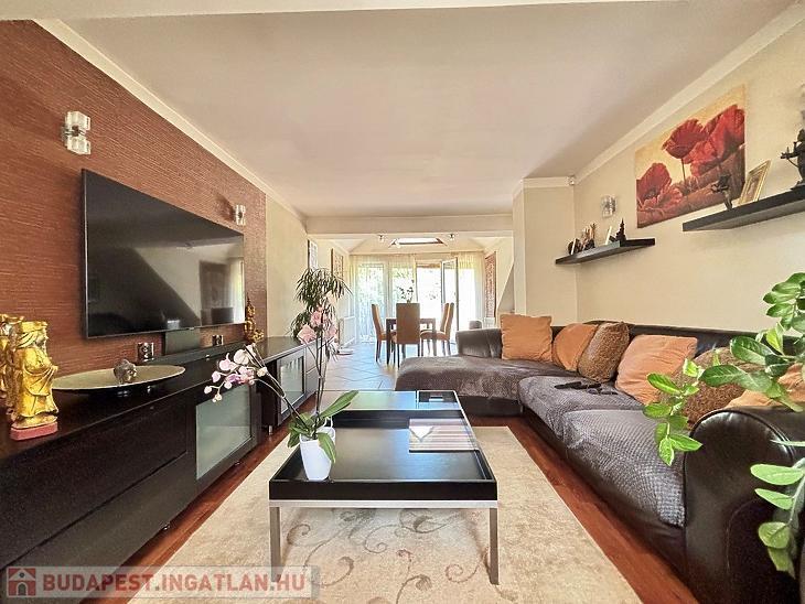 A lakás 3 különnyíló szobával rendelkezik (14, 16 és egy 33 m²-es nappali), utóbbiból közvetlen kijárat nyílik a napfényes, 10 m²-es teraszra. A konyha tágas, kamrával és francia erkéllyel. Külön fürdő, két WC, gardrób, valamint saját padlás és tároló is tartozik hozzá. A hálószobák klimatizáltak, a nappali igény esetén könnyen kettéosztható, így akár egy plusz szoba is kialakítható. A lakáshoz kizárólagos kertkapcsolat is jár.