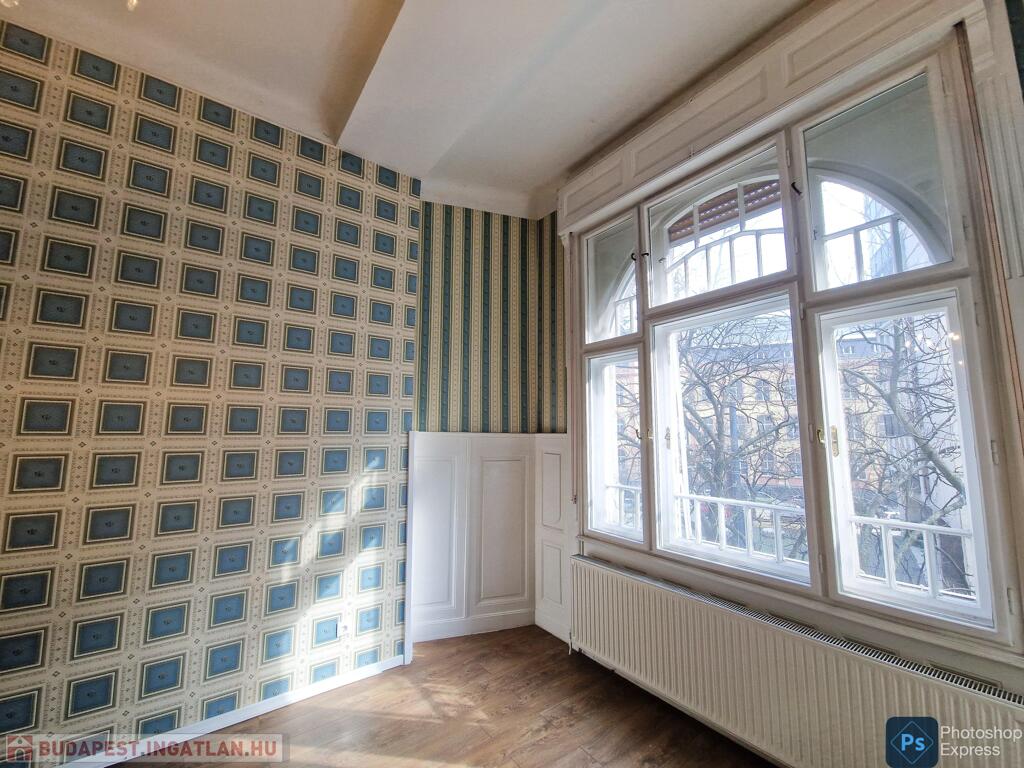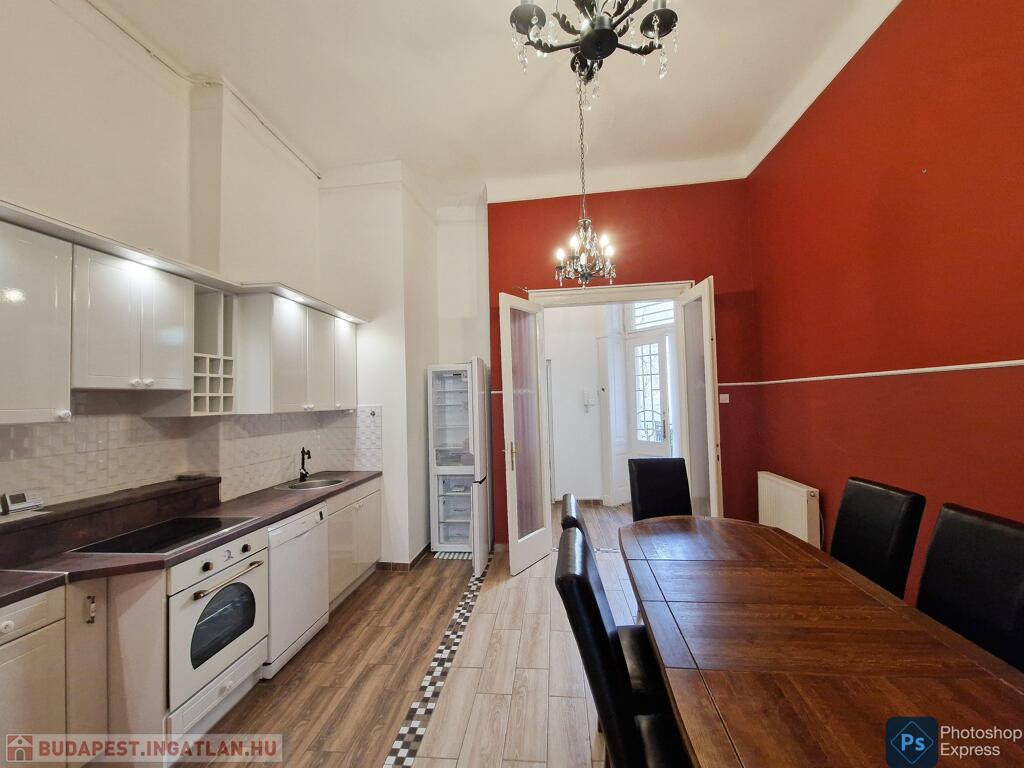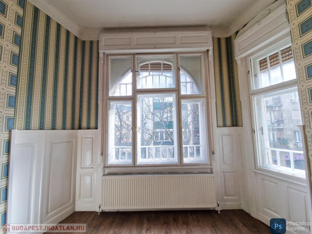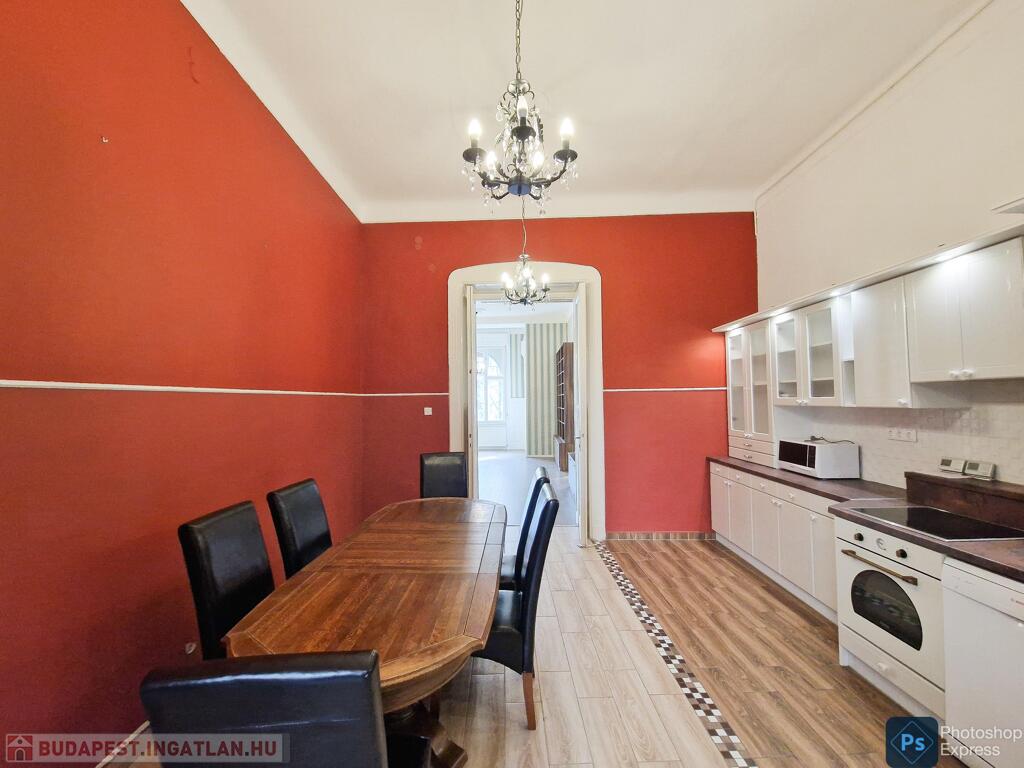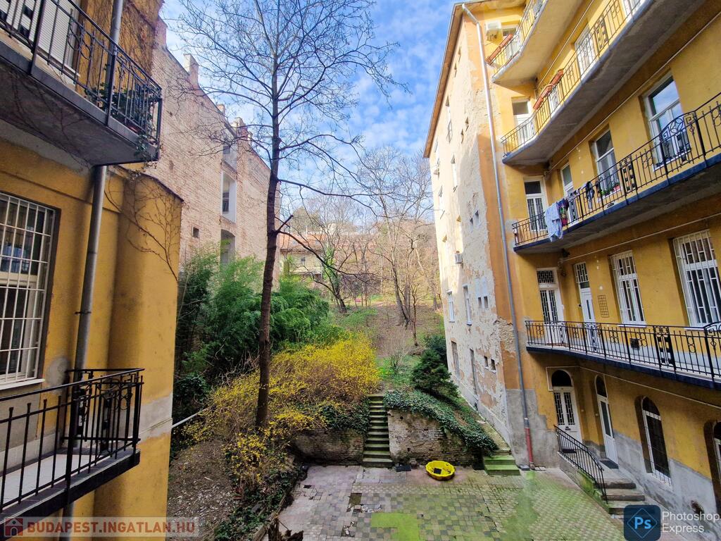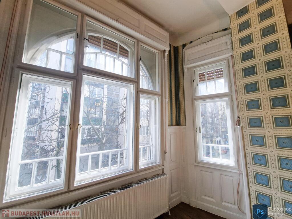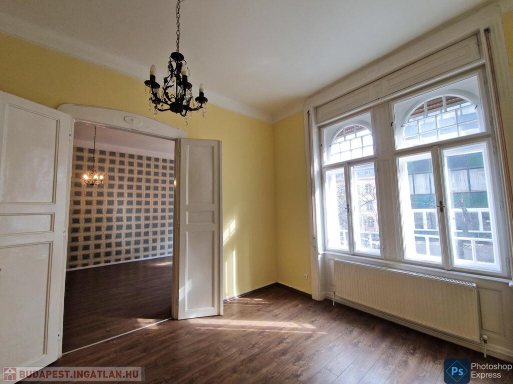 A több,mint 100 éves ház fel van újítva,és csodálatos belső kerttel rendelkezik. Az két lakás egybenyitásával kialakított ingatlan első emeleten található,körfolyosósóról megközelíthető. A kétszárnyú bejárati ajtó tágas előtérbe vezet,és az egész lakást a nagyvonalú ,tágas terek jellemzik.