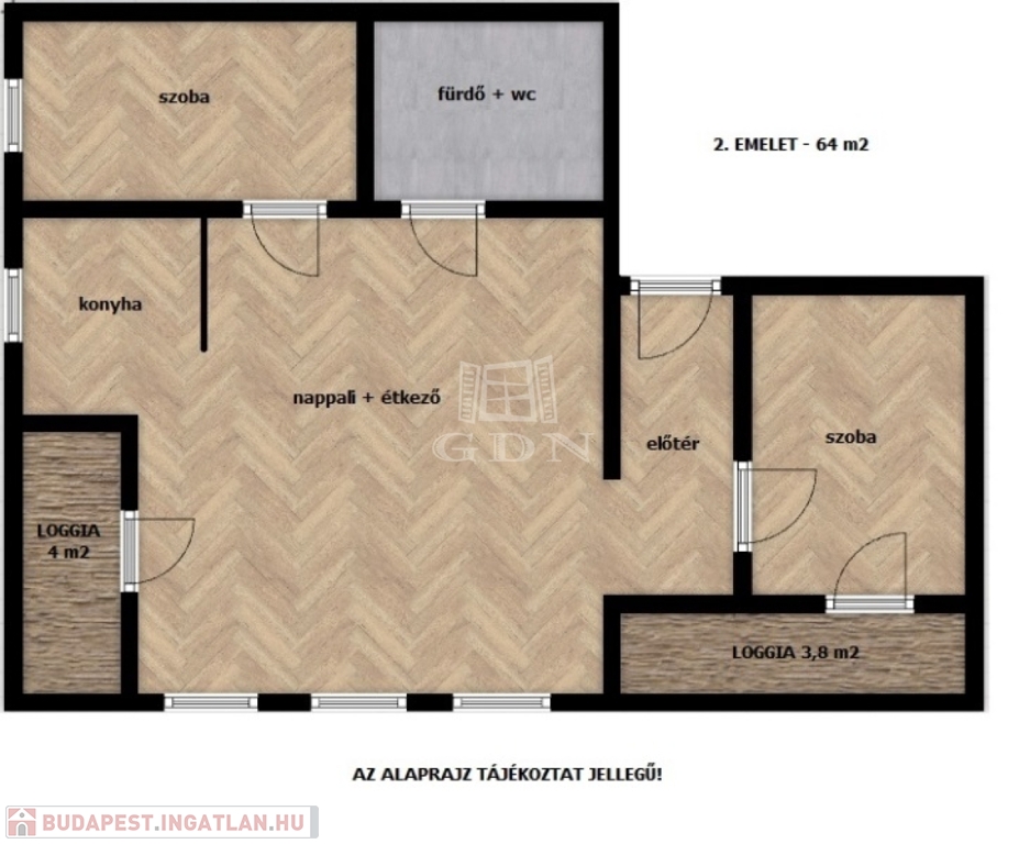 2. EMELET: 64 m2 – 3 szoba – 1 fürdő – LOGGIA: 8 m2