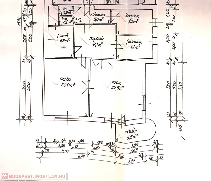 From the ante-room we reach the 11 sqm hall, from which we can access the 3 rooms with separate entrances: the living room is 25.5 sqm, which has a 6 sqm balcony, the bedroom is 20 sqm, and the 3rd room is 7 sqm. There is also a double-wing door between the living room with separate entrance and the bedroom.