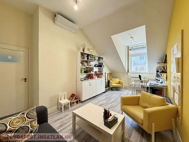 A ház legfelső szintjén található lakás különleges hangulatát az ablakoknál megjelenő enyhe tetőtéri lejtés adja, ugyanakkor a belső terekben sehol nincs lejtés, így a lakótér teljes értékű és jól kihasználható.