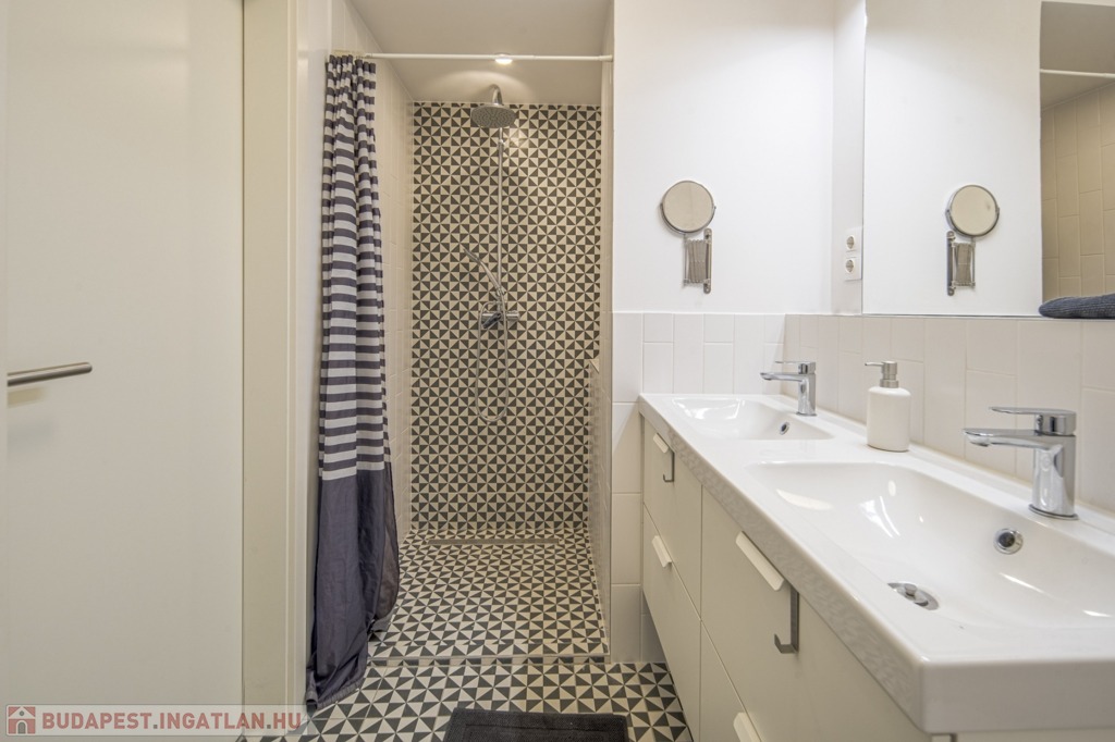 A fürdőszoba zuhanyzós, duplacsappal szerelt, valamint a külön WC mellett itt is található WC.