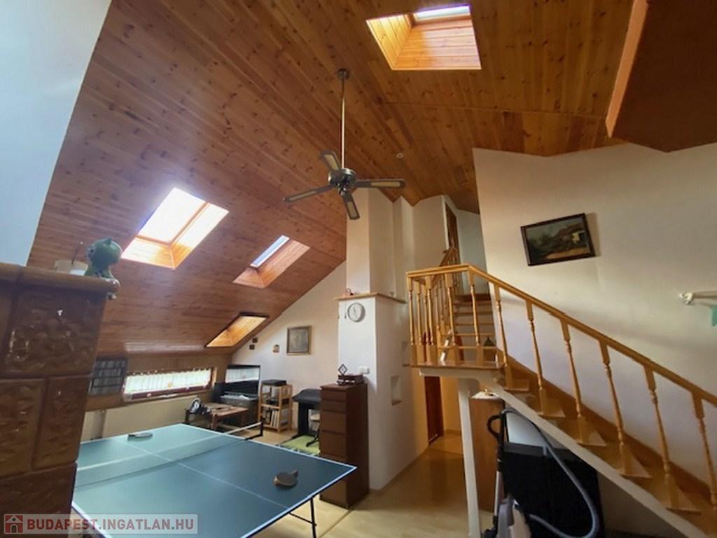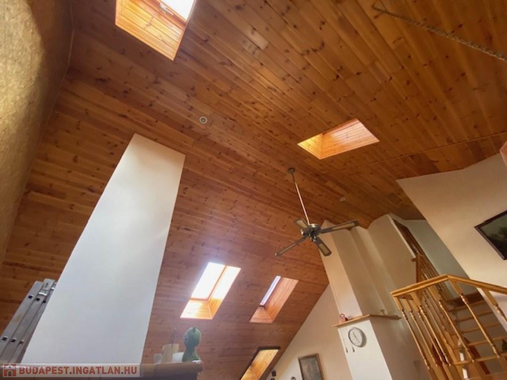Az előszobából a másik irányba haladva érünk be az ingatlan fő attrakciójához, egy kb 50 nm-es, 4,5 belmagasságú ( legmagasabb pontja) nappaliba. Itt találhatjuk a világos, tágas amerikai konyhát, étkezővel. A nappali további részén jelenleg többek közt pingpong asztal is helyet kapott. Az otthonos, meleg hangulatról a mennyezeti , dupla szigetelésű falambéria, a cserépkályha és egy kandalló gondoskodik.