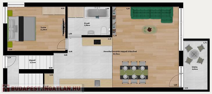 A felső szinten egy amerikai konyhás nappali, hatalmas faltól-falig érő ablakokkal, egy hálószoba és egy fürdőszoba került kialakításra. A nappaliból nyílik a 6nm-es erkély, mely üvegkorlátot kapott. Minden bútor, beleértve a gépesített konyhabútort is, egyedi tervek alapján készültek, kifejezetten ide.