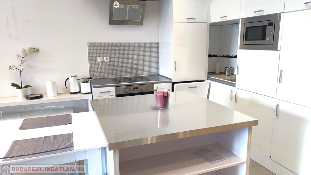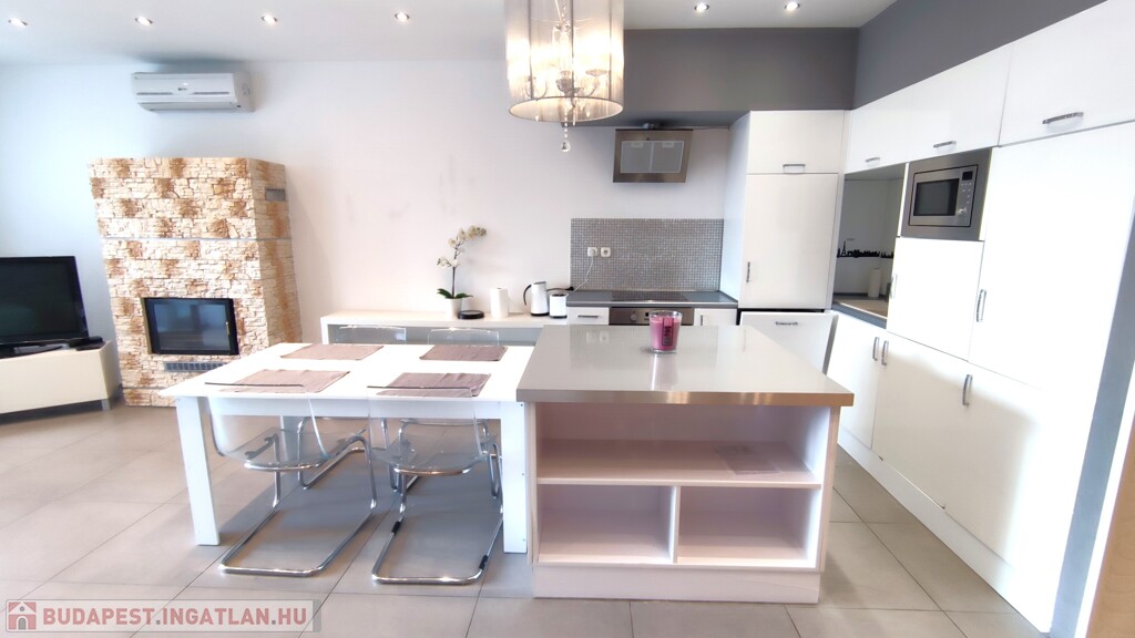 A konyha elektromos tűzhellyel, mosogatógéppel, hűtővel, mosógéppel felszerelt, konyhasziget is tartozik hozzá.