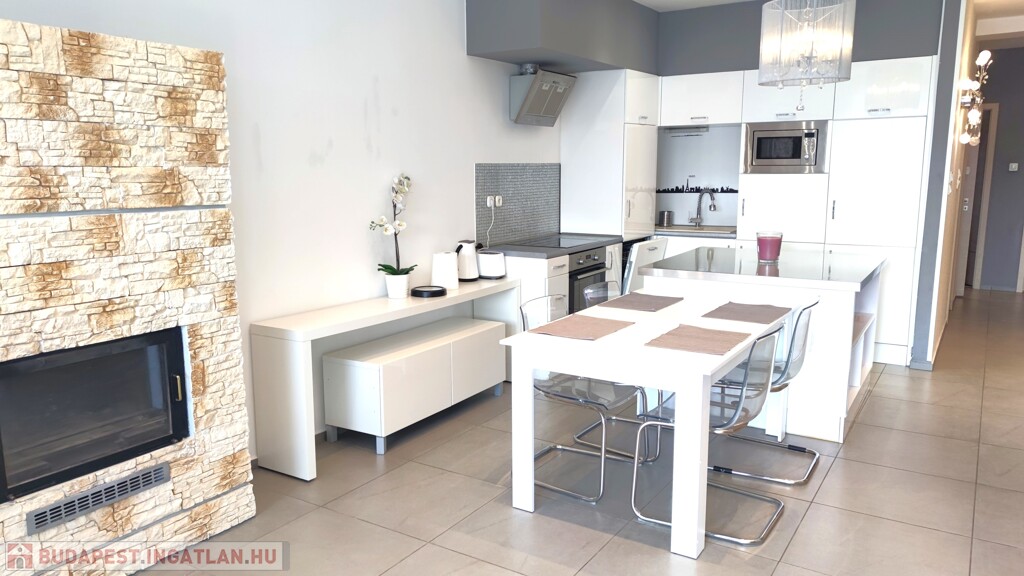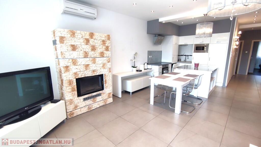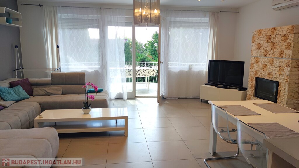 Az amerikai konyhás étkező-nappali hatalmas ablakain árad be a napfény, az erkélyről pazar kilátás nyílik a belső kertre és a medencére. Az elektromos kandalló kellemes hangulatot áraszt. Az ablakok redőnyökkel felszereltek. A lakást 2006-ban teljeskörűen felújították.