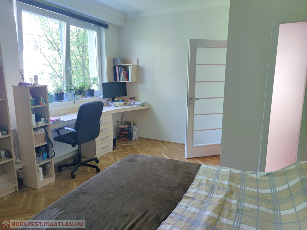 Bp., 2.ker. TÖRÖKVÉSZ ÚTON, Rózsakert Bevásárlóközpont közelében, az utcától távol eső, 120 nm-es, nappali + 2 hálószobás, étkező konyhás, félemeleti, FELÚJÍTOTT, nagy teraszos lakás eladó dupla garázzsal.