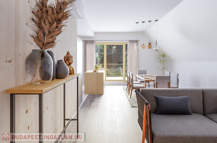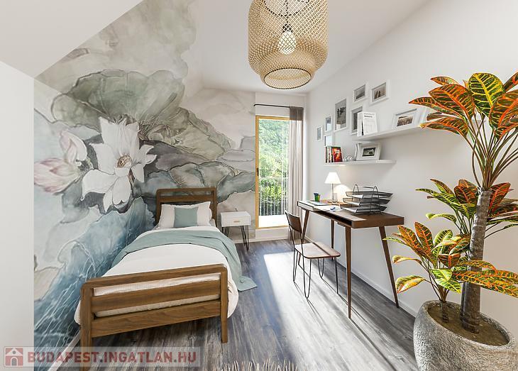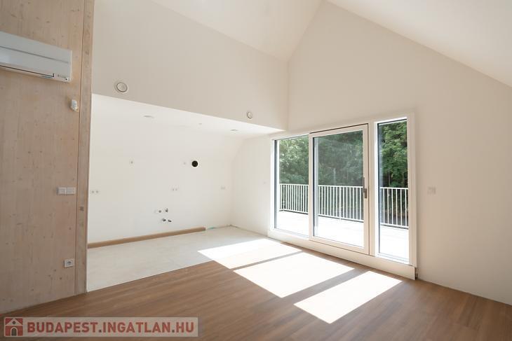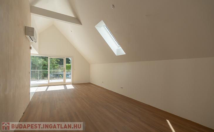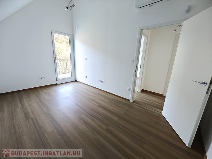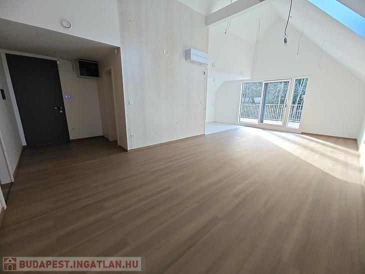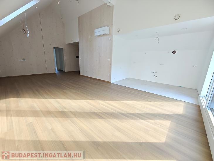 Az eladásra kínált lakás a társasház legfelső lakása, mely amerikai konyhás nappaliból, 2 hálószobából, fürdőszobából és külön wcből áll. A hálószobákból nyílik egy 5nm-es erkély, illetve a nappaliból nyílik egy 16nm-es napfényes terasz. A lakás ugyan tetőtéri, de a tervezéskor gondoskodtak a jól bútorozhatóságról, ezért a térdfal 1,70cm.