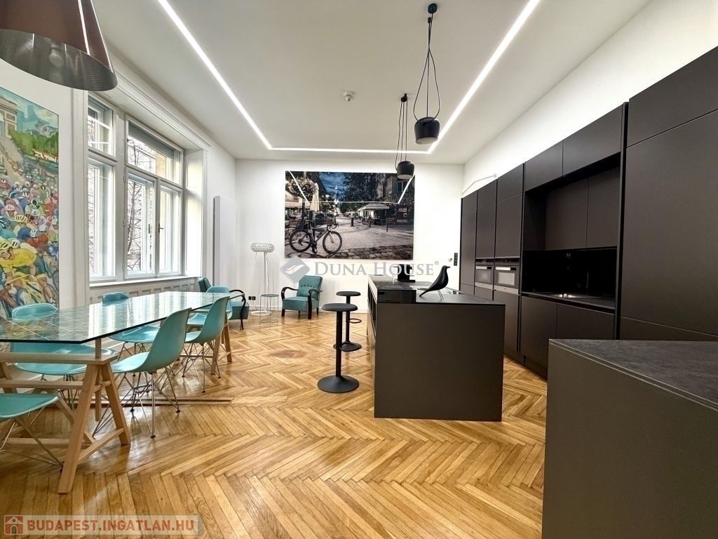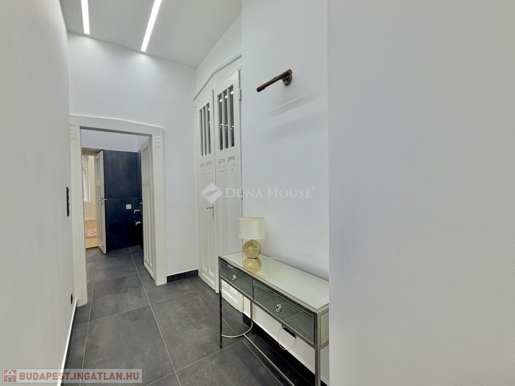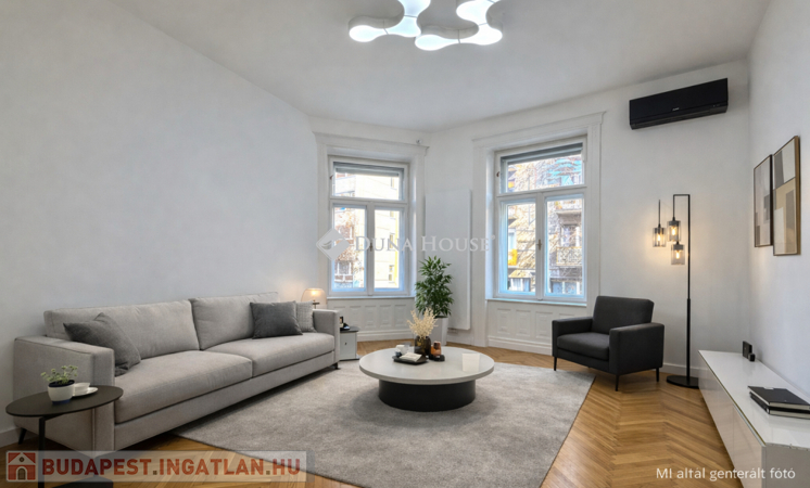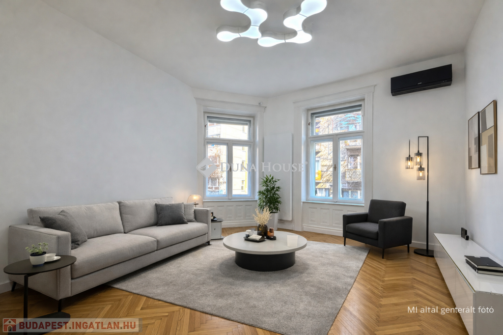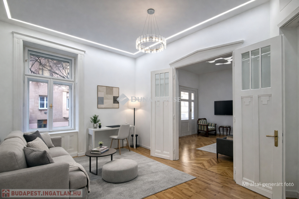 Ebben a környezetben kínálunk megvételre egy 100 m²-es, igényesen felújított lakást, amely egy liftes, téglaépítésű társasház félemeletén található. A 3 métert meghaladó belmagasság és a jól átgondolt térszervezés kellemes, tágas térérzetet ad az ingatlannak.