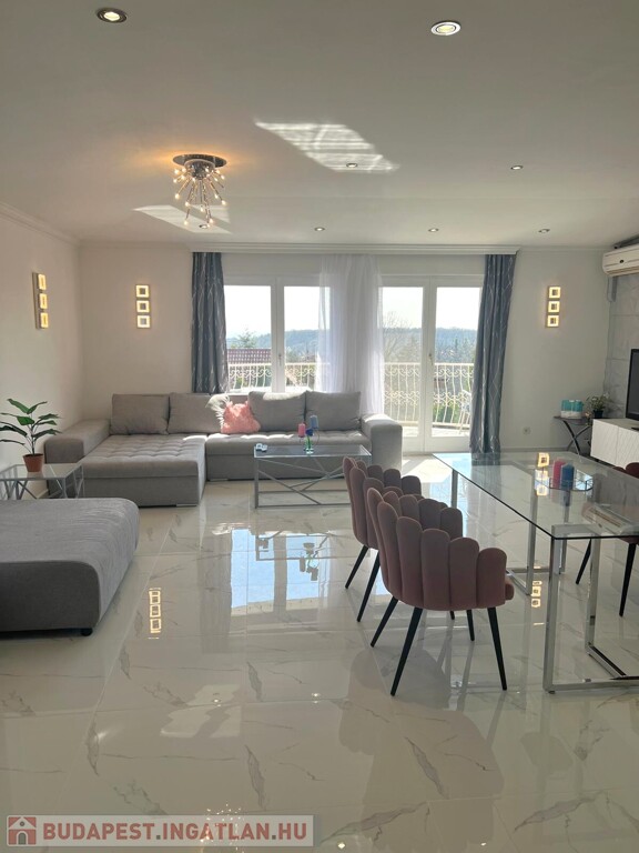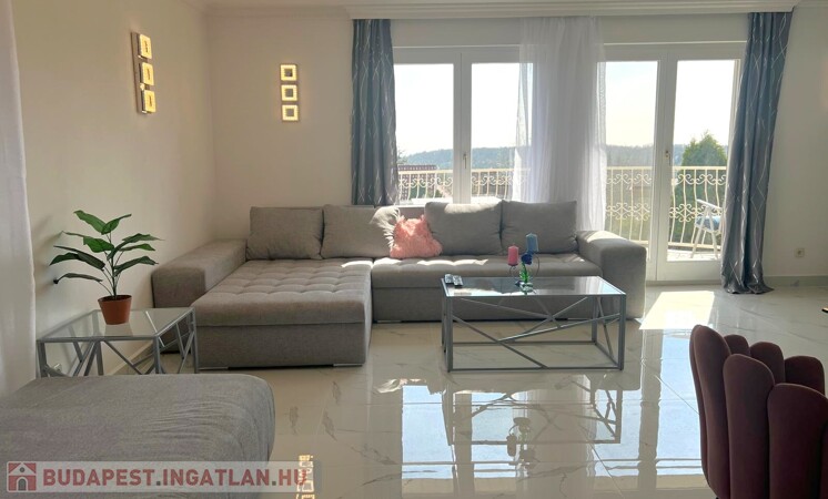 Az amerikai konyhás étkező-nappali hatalmas ablakain árad be a napfény, az erkélyről gyönyörű panorámát élvezhetünk a budai hegyek felé, valamint a medencés kertre. Az ablakok redőnyökkel felszereltek. A lakást 2006-ban teljeskörűen felújították.