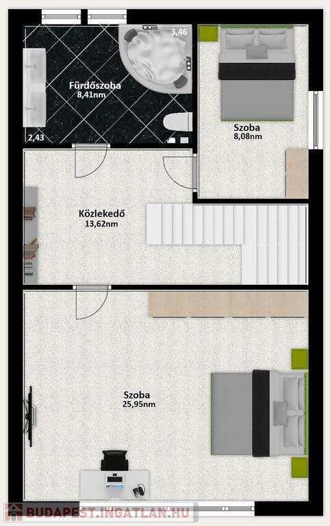Az emeleten egy nagy szülői háló kapott helyett (ez régen 2 külön szoba volt), egy gyerek háló/dolgozó és egy kényelmes fürdőszoba.