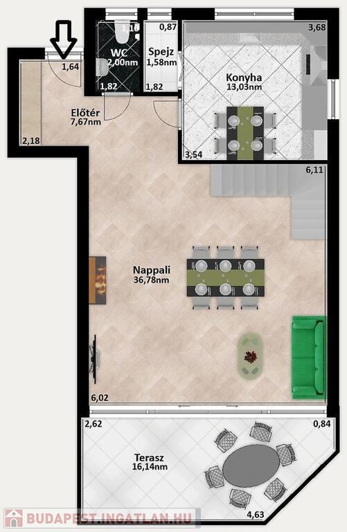 A földszinten helyezkedik el a lakás központi része, mely elsősorban a hatalmas nappali, közvetlen terasz kapcsolattal, ahonnan gyönyörű kilátásban részesülhetünk Jánoshegy irányába. Szintén ezen a szinten található a nagy méretű konyha, spejz, egy külön wc és egy előtér.