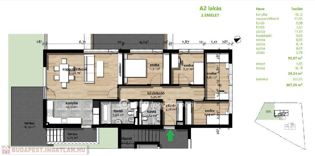 A megvételre kínált ingatlan a második emeleten található és 107,1 nm-es, amihez tartozik összesen 20,24 nm terasz és 367,65 nm privát kert. Elosztását tekintve nappali + 4 hálószobával rendelkezik, ami igény szerint még módosítható akár nappali + 3 hálószobára is, ha inkább nagyobb lakóegységekre van szüksége. Két fürdőszoba került kialakításra, így dupla komfortosnak tekinthetjük, a privát kertkapcsolat a teraszról érhető el. Hatalmas és egyben jól tájolt nyílászáróinak köszönhetően a nap minden szakaszában világos, tájolása Dél-nyugati. Igény szerint az épületben garázs és tároló is vásárolható a lakáshoz, melynek vételárát a meghirdetett ár nem tartalmazza.