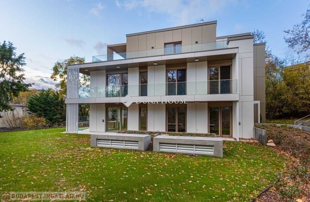 A dús növényzettel teli, 2234 m2-es telekre épült 3 szintes ingatlan a városi kényelem és a természetközeli élet ideális kombinációját kínálja. A tervezés során kiemelten ügyeltek a privát terekre. Nagy figyelmet kapott a praktikusság, a tágas élettér és a kényelmes, jól kihasználható teraszok kialakítása, melyek alapterületének arányos része a megadott összterületbe is beleszámít. A teraszok jacuzzival és pergolával felszereltek.