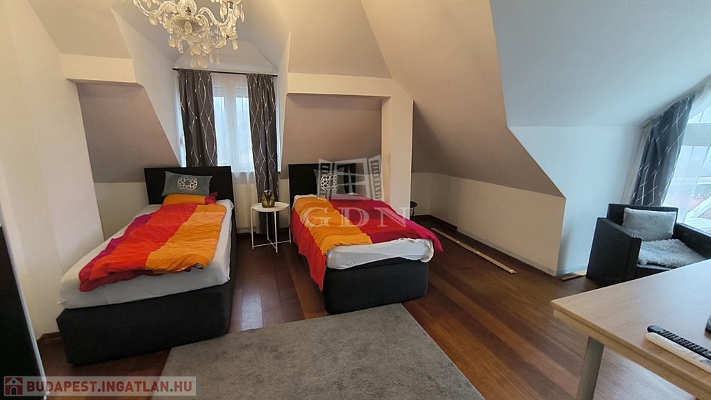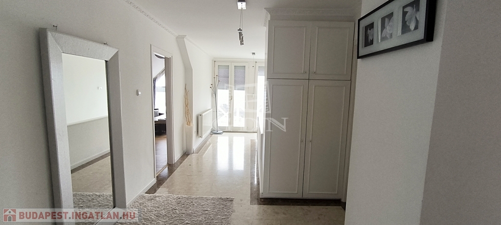 Eladó a II. kerület Törökvész csendes utcájában egy belső kétszintes, 161 m²-es luxuslakás, amely örök panorámát kínál a budai hegyekre. Az ingatlan a 2000-es évek elején teljes körűen felújított, folyamatosan karbantartott, mindössze háromlakásos társasház része.