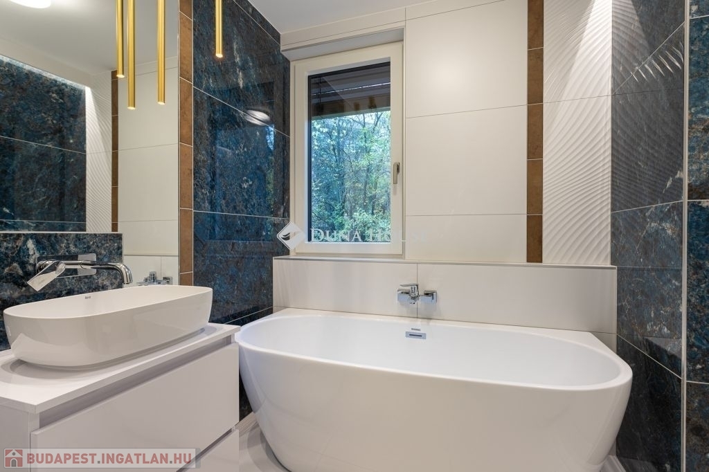 A dús növényzettel teli, 2234 m2-es telekre épült 3 szintes ingatlan a városi kényelem és a természetközeli élet ideális kombinációját kínálja. A tervezés során kiemelten ügyeltek a privát terekre. Nagy figyelmet kapott a praktikusság, a tágas élettér és a kényelmes, jól kihasználható teraszok kialakítása, melyek alapterületének arányos része a megadott összterületbe is beleszámít. A teraszok jacuzzival és pergolával felszereltek.