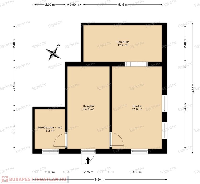 - konyha, szoba + tágas hálófülke, fürdőszoba WC-vel elrendezés;