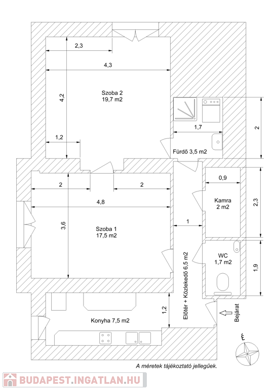 • 2 külön nyíló szoba, fürdőszoba, konyha, kamra, mosdó