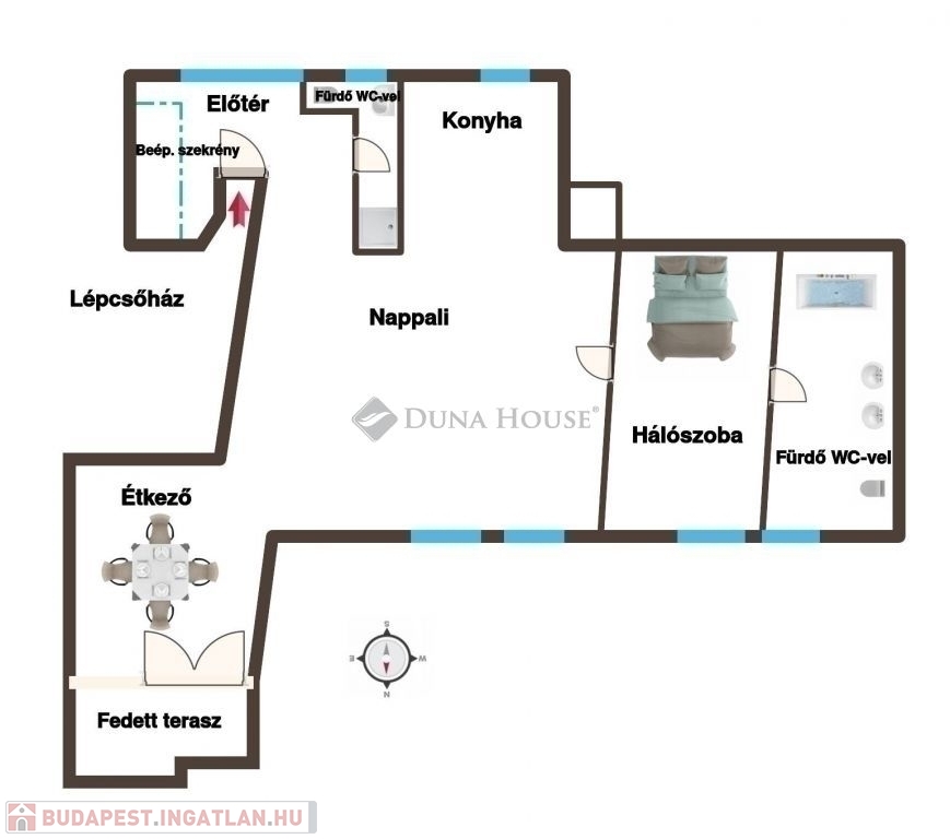 49 m2-es, fedett teraszos, belső kertre néző gyönyörű Otthon egy kevés lakásos, zárt lakóparkban található. A fényárban úszó előtérből a nagyméretű nappaliba érkezünk. Innen nyílik egy elszeparált étkező, abból pedig a hangulatos fedett terasz kilátással a kertész által gondozott belső kertre. Mindkét fürdőszobában olaszos stílusú csempe díszíti a falakat, a nagyobb fürdőszobában pedig egy hatalmas jakuzzis kád is van.