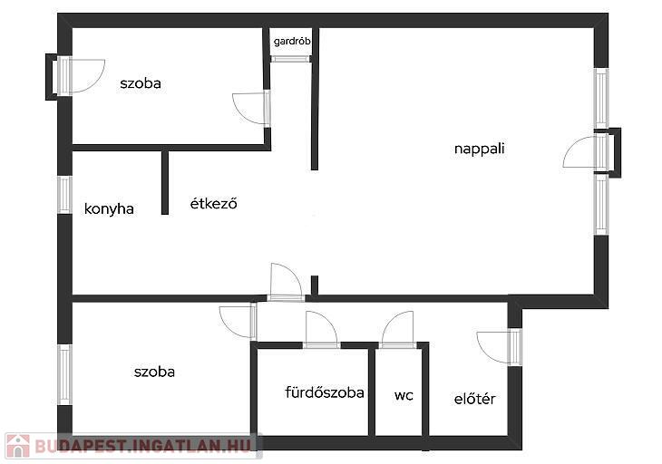A nappali faparketta, a két szoba laminált parketta, illetve a vizeshelyiségek és a közlekedő járólap burkolattal rendelkezik.