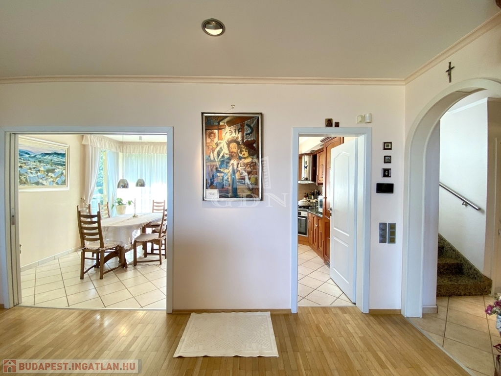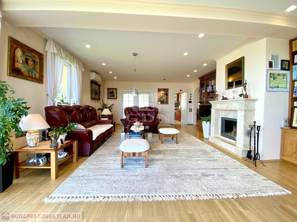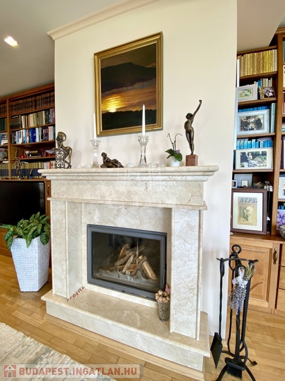A hatalmas, 44 m2-es nappaliban egy gyönyörű márványkandalló kapott helyet, amely hűvösebb időben meghitt, kellemes hangulatot varázsol. A nappaliból egy üveg tolóajtóval elválasztott étkező és konyha nyílik. Ha akarjuk, egybenyithatjuk a két teret.