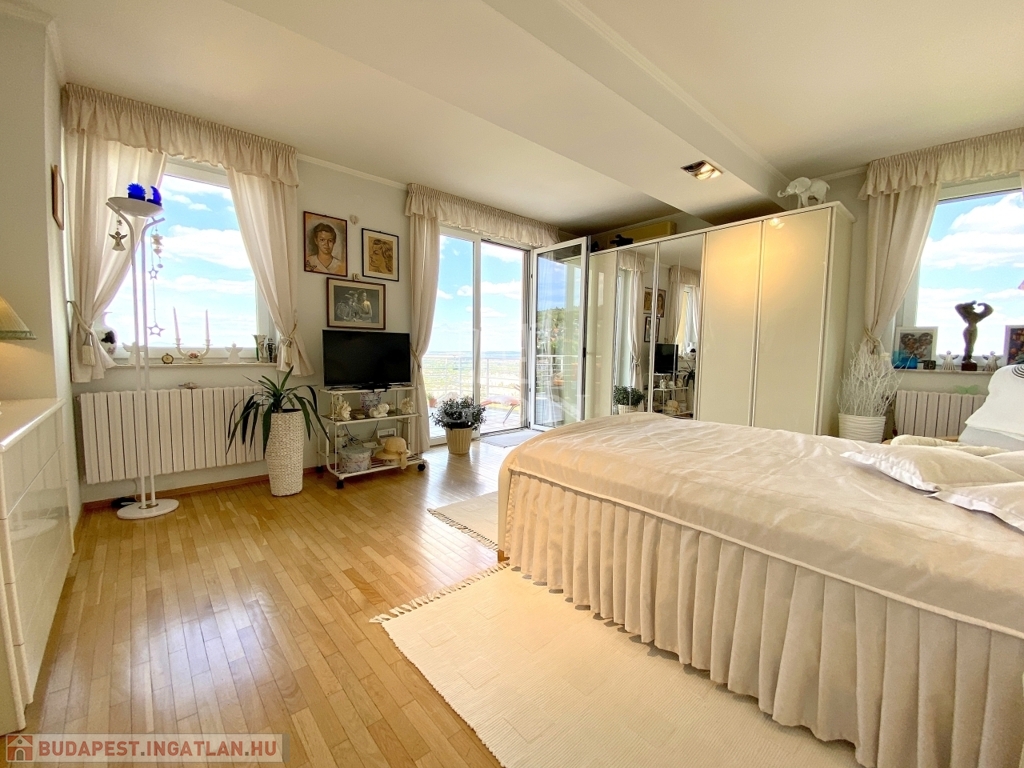 Mindkét szoba panorámás. A nagyobb hálószoba egy közel 20 m2-es teraszkapcsolattal rendelkezik.