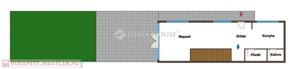 – belső kétszintes elrendezés: lent tágas nappali, konyha, étkező, mosdó, terasz- és kertkapcsolat