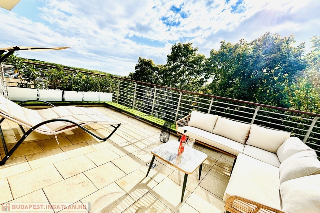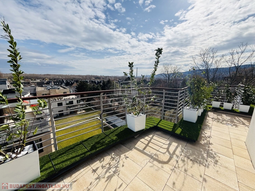 A 72 m²-es, nappali + 3 szobás lakás kifinomult belső tereit egyedülálló, 87 m²-es körpanorámás terasz egészíti ki, amelyről lenyűgöző 180 fokos kilátás tárul eléd: a Budai Vár, Gellért-hegy, Megyeri-híd és a MOL torony mind egyetlen pillantással belátható. A teraszt zöld növényzet és árnyat adó fasor öleli körbe, garantálva az intimitást és nyugalmat – mindezt egy nyitható pergolával, stílusos kerti bútorokkal és természetközeli hangulattal.