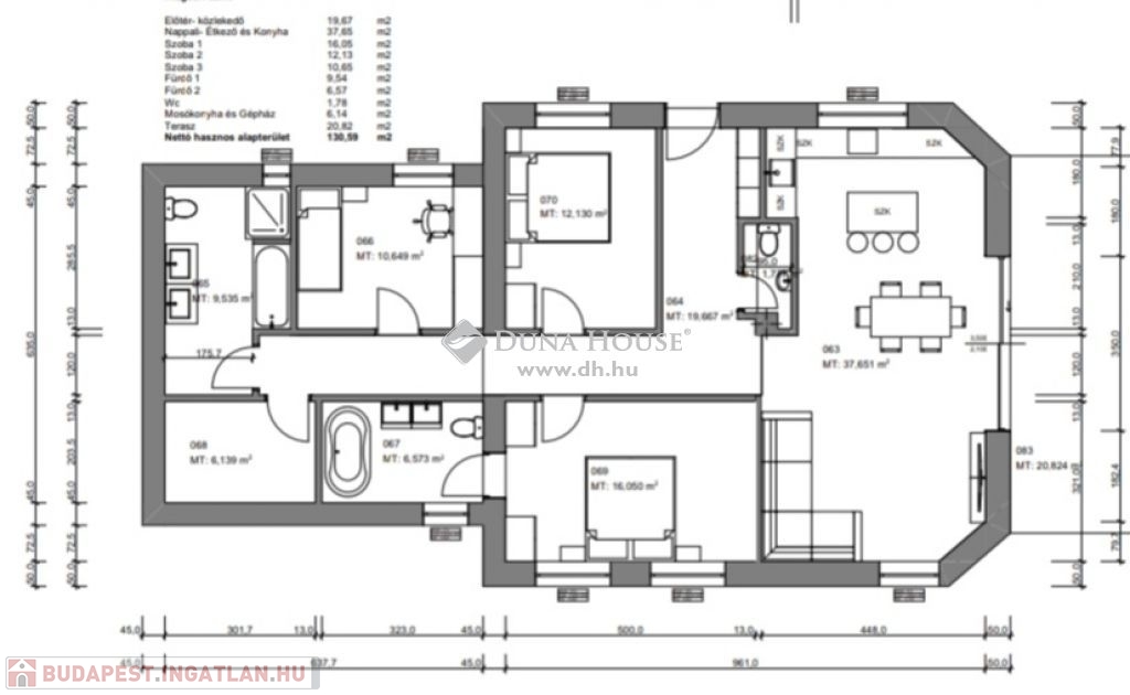 Az ingatlan az alábbi helyiségekből áll: panorámás nappali + konyha, 3 szoba, előszoba, 2 db fürdő +wc, lépcsőtér, erkély, háztartási helyiség.