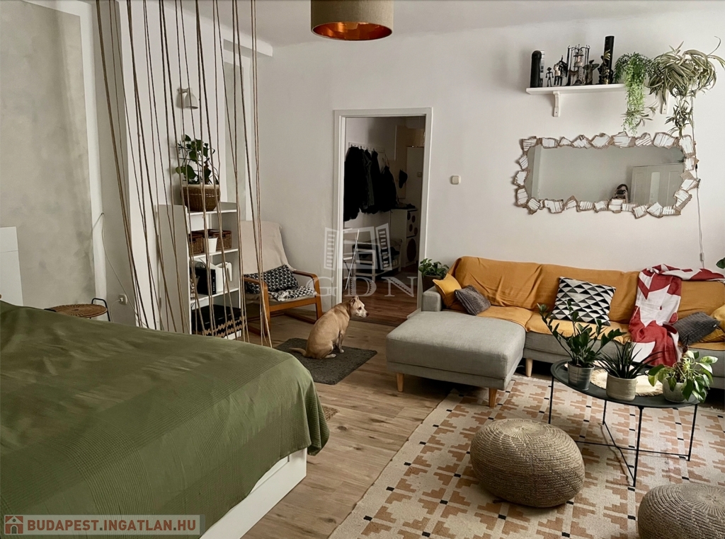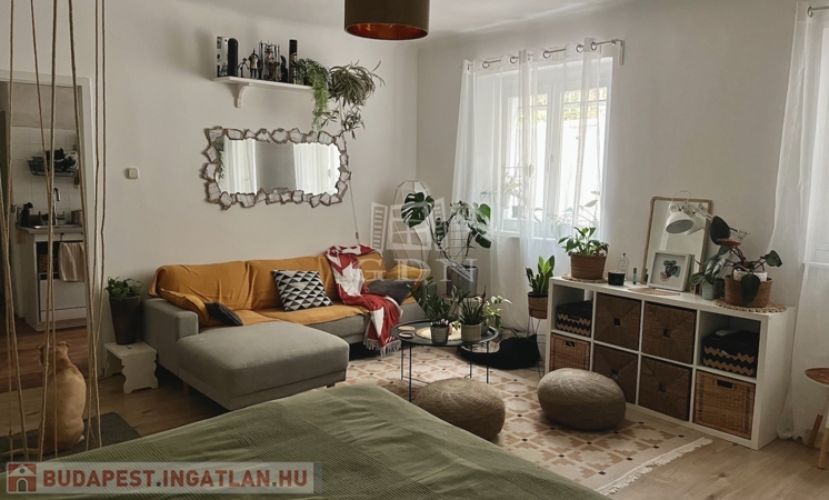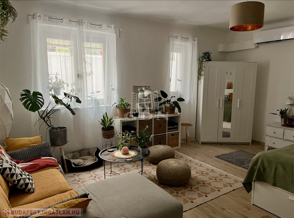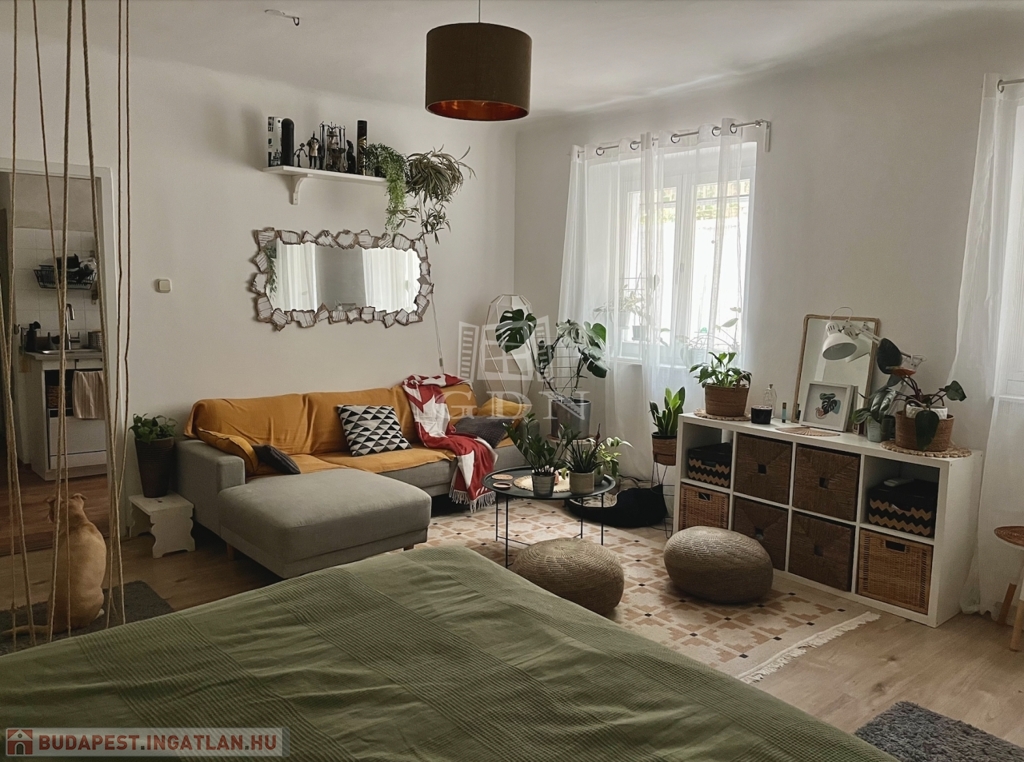 A lakás egy tágas szobából áll, melynek ablakai a kellemes kertre néznek, így garantálva a nyugodt, természetközeli életérzést.