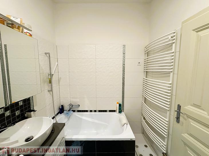 A fürdőszoba új burkolatot kapott és új akrilkáddal rendelkezik. A mosógép ebben a helyiségben kapott ki- és beállást.