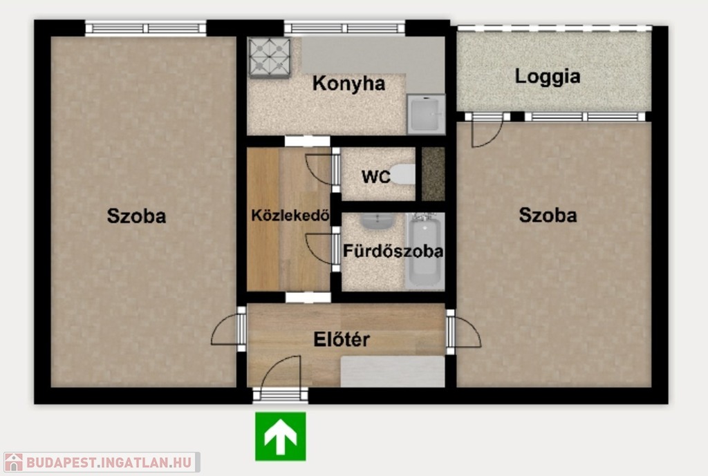 Az ingatlan elosztása rendkívül praktikus: két külön nyíló szoba biztosít kényelmes életteret akár pároknak, kisebb családnak vagy befektetési célra is ideális választás lehet. A nappaliból nyíló loggia kellemes kikapcsolódási lehetőséget nyújt, ahonnan zöld parkra nyíló kilátás fogad – tökéletes helyszín egy reggeli kávéhoz vagy esti pihenéshez.