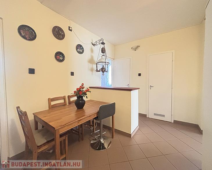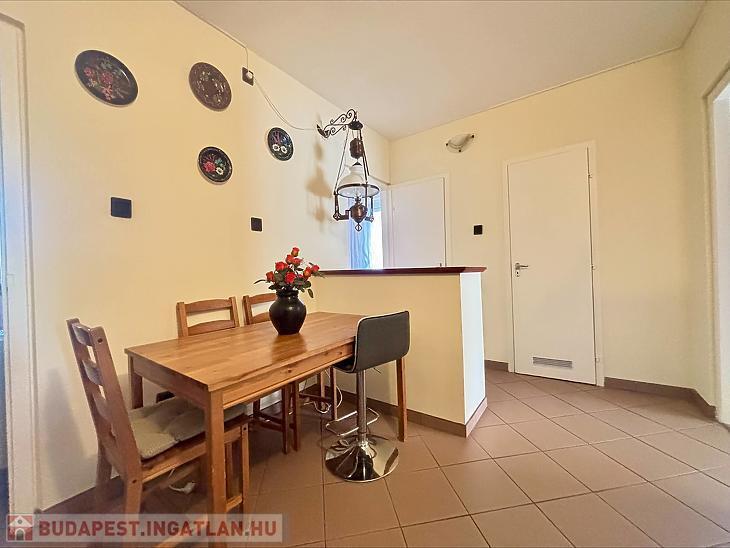 A belső terek átgondolt kialakítása otthonos hangulatot teremt: a közös terekben és a vizes helyiségekben tartós, elegáns járólap található, a nappalit szőnyegpadló, a másik szobát pedig jó állapotú faparketta borítja.