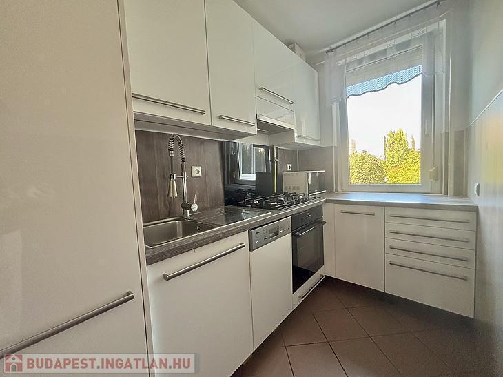 A konyha a lakás egyik ékköve: felújított, modern hangulatú, igényesen kialakított, és bőséges munkafelületet kínál a mindennapi főzéshez.