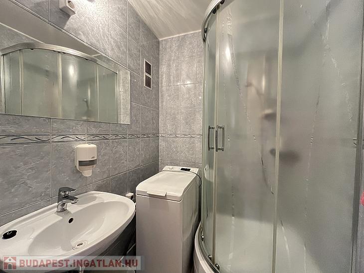 A fürdőszoba új burkolatot kapott, zuhanykabinos. A mosógép be-és kiállása is ebben a helyiségben lett kialakítva.