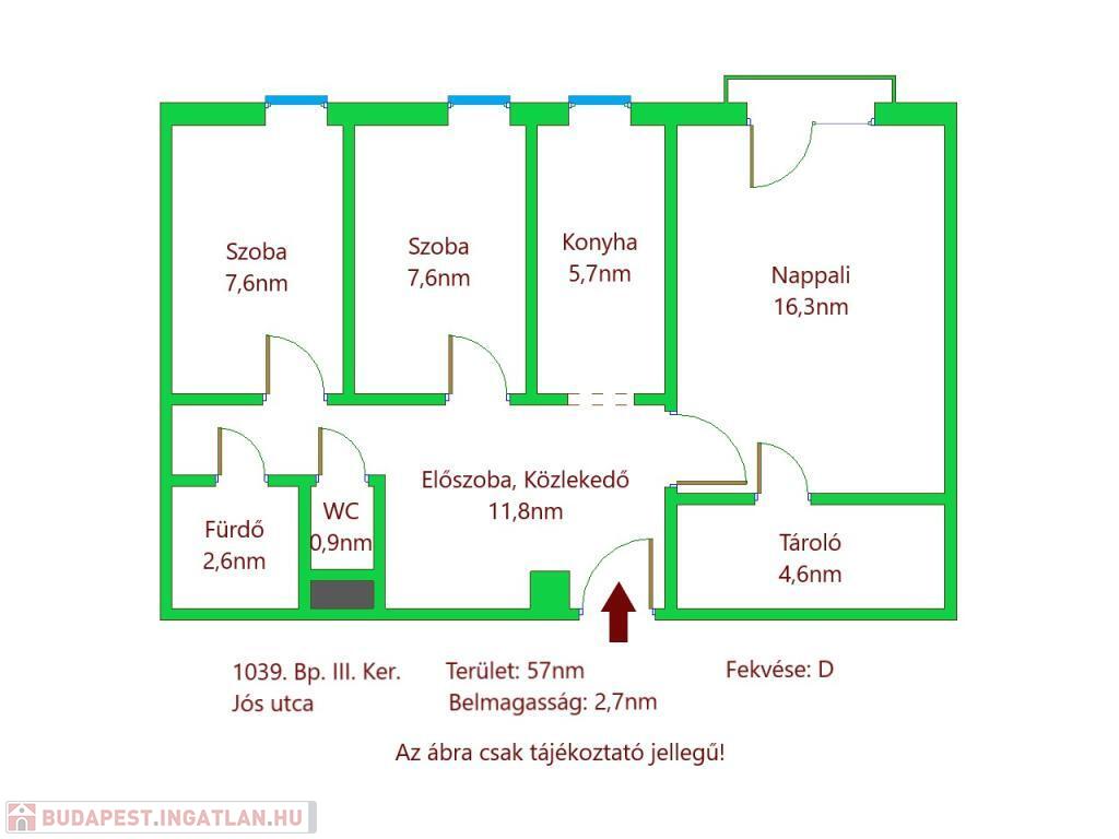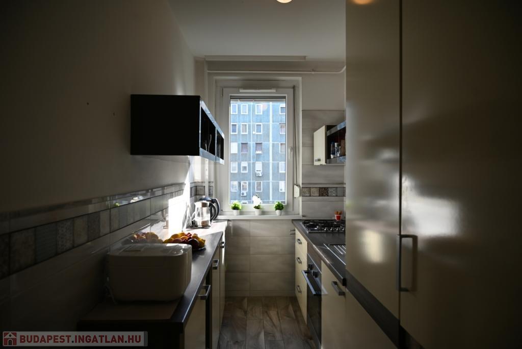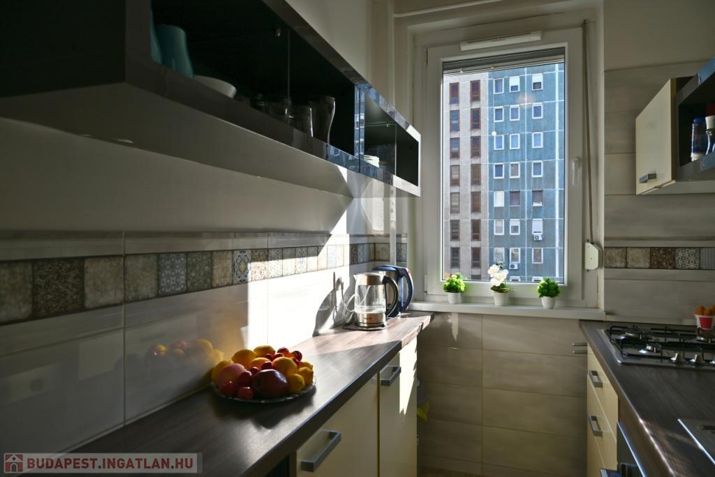 Eladó Budapest III.ker. Jós utcában - Békásmegyer Duna felőli oldalán - rendezett, jó lakóközösségű, liftes, átlagos állapotú ház V. emeletén, egy 57 nm-es, 1+2 szobás (külön nyílóak), franciaerkélyes, világos, tehermentes, pár éve felújított lakás, beépített bútorokkal.