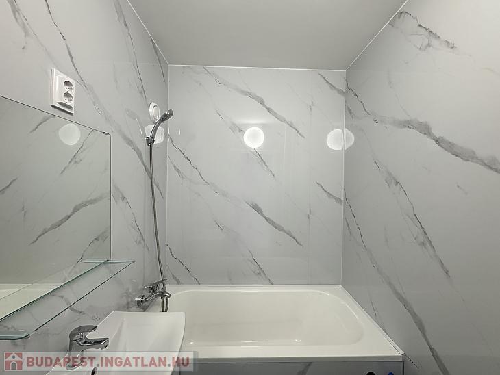 A fürdőszoba új burkolatot kapott és új akrilkáddal rendelkezik. A mosógép ebben a helyiségben kapott ki- és beállást, a WC egy külön helyiségben található.