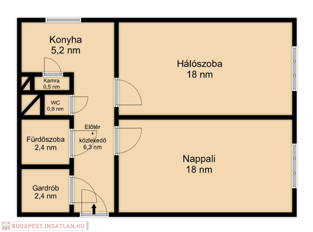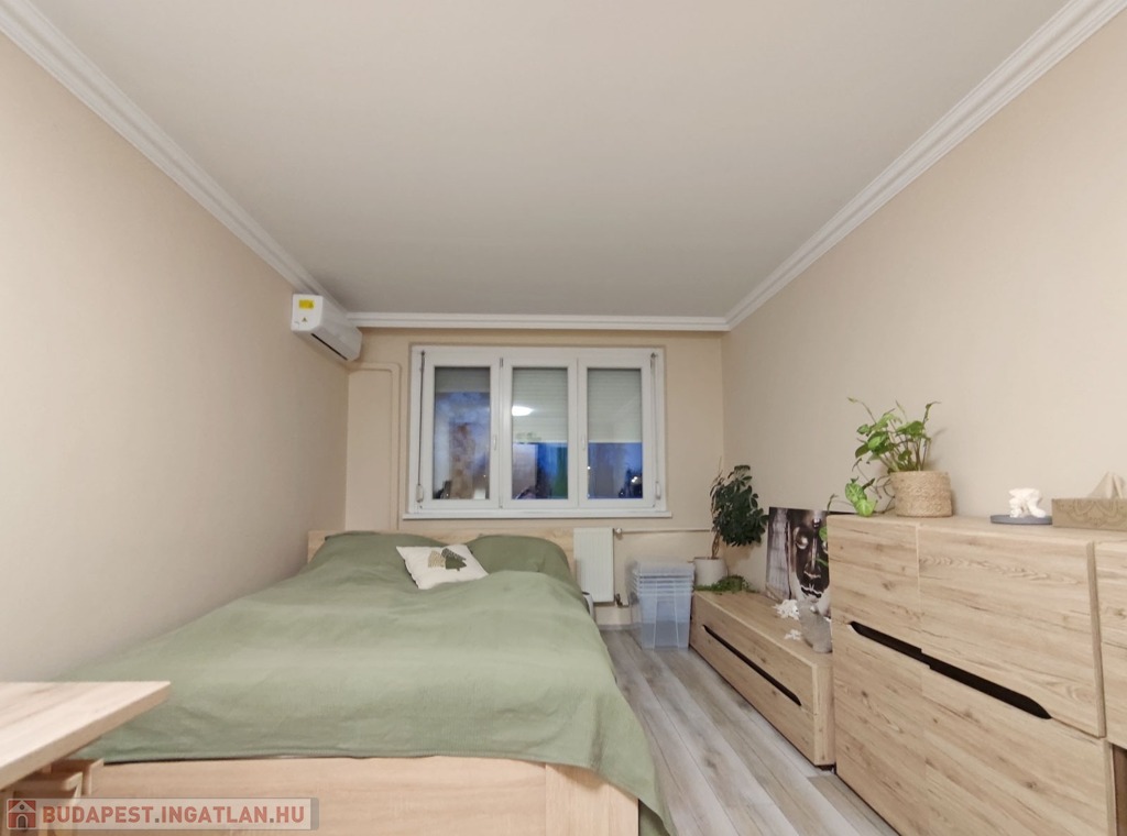 A több ponton záródó jó minőségű biztonsági bejárati ajtón keresztül a teljesen felújított és szépen karbantartott állapotú, a külön nyíló szobák elrendezését tekintve jó elosztású, délkeleti tájolású klimatizált lakásba érkezünk. A bejárattól szemben a közlekedő végében találjuk a konyhát a kamrával, bal oldalon a vizes helyiségek, a bejárati ajtó mellett balra a gardrób, jobb oldalon pedig a szobák nyílnak meg. A kerámia burkolatú előszobában közvetlenül jobb kéz felől járólap burkolatú, tágas, világos, parkra néző, 18 nm-es, műanyag ablakos, redőnyös, új, minőségi LG márkájú klímával szerelt nappaliba jutunk. A közlekedőben közvetlenül a nappali mellett jobbra nyílik a másik, szintén 18 nm-es, minőségi parketta burkolatú hálószoba. A szobából kilépve a közlekedő végében juthatunk a járólapos, lihthofos (világítóablak) szúnyoghálós ablakos, gépesített, 4 gázlángos és elektromos, légkeveréses sűtős tűzhellyel felszerelt, mosogatóval is beépített konyhába. A konyhából visszafelé haladva, jobbra találjuk a külön nyíló, járólappal és csempével burkolt, 2,4 nm-es fürdőszobát, mellette pedig a szintén minden elemében felújított, járólapos toalettet.