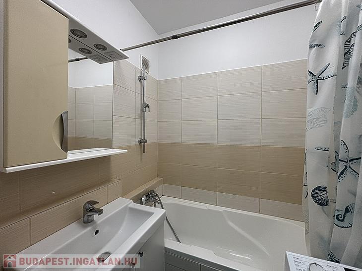 A fürdőszoba szintén teljesen megújult: új akrilkád és új burkolatok kerültek be, letisztult, időtálló stílusban.