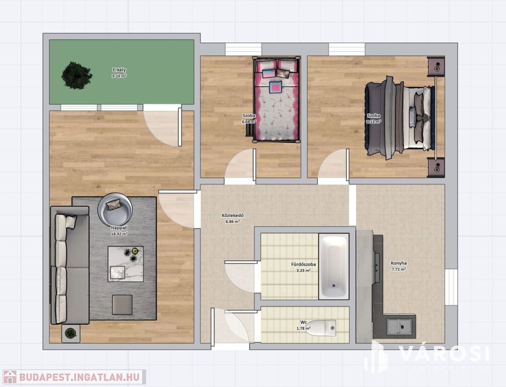 A lakás világos, praktikus elosztású: a szobákban laminált padló, míg a közlekedőben, konyhában, fürdőben és WC-ben hidegburkolat található.
