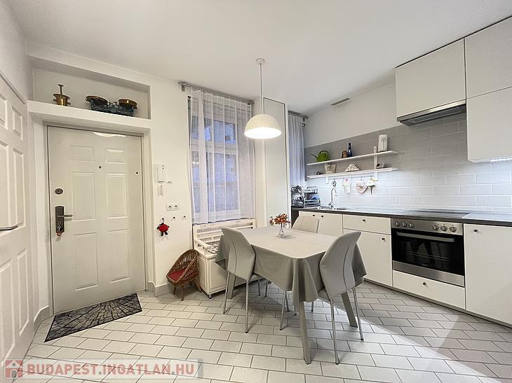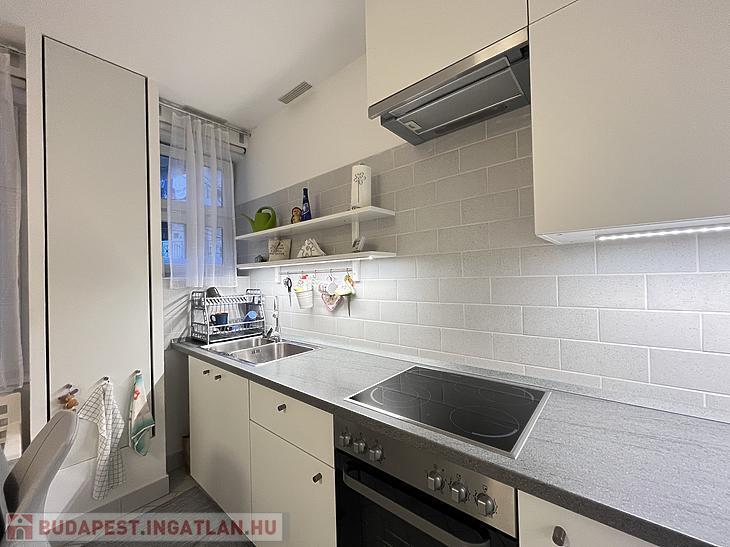 A konyha új bútorzatot kapott, étkezővel rendelkezik. A mosógép ki-és beállása ebben a helyiségben került kialakításra.