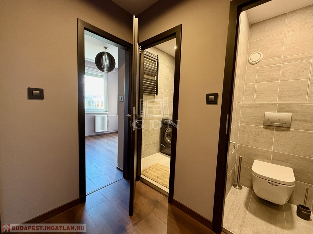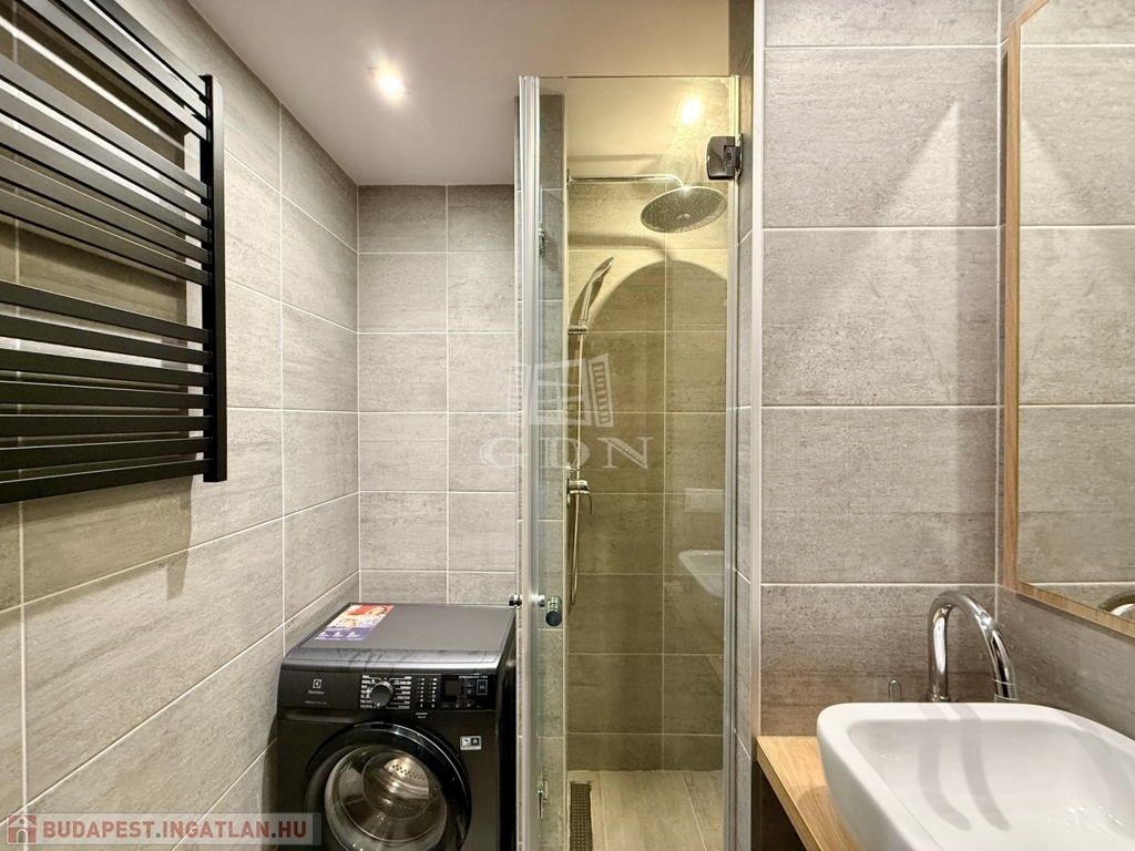 A hálószoba csendes, jól berendezhető, a fürdőszoba pedig modern, visszafogott stílusú, épített zuhannyal és minőségi burkolatokkal. A mosógép diszkréten, beépítve kapott helyet, a külön WC pedig érezhetően növeli a komfortot.